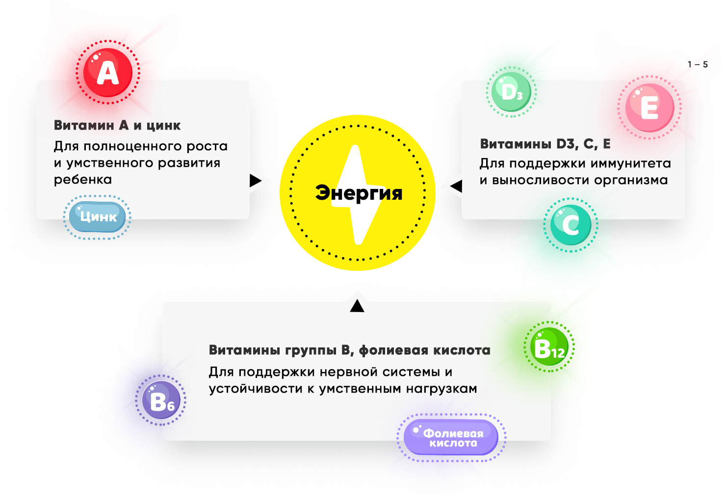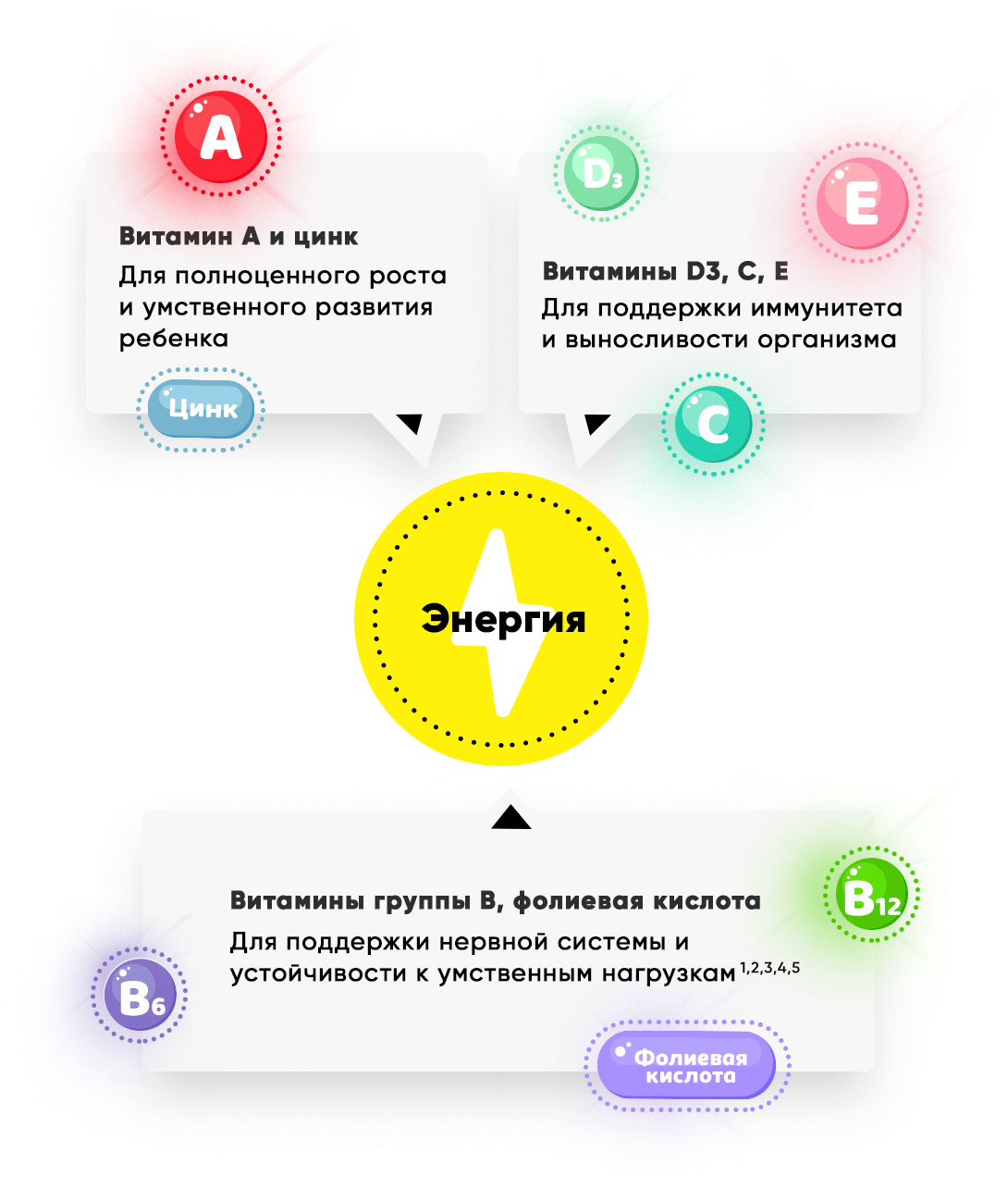 Область применения: рекомендуется в качестве биологически активной добавки к пище для детей старше 3-х лет – дополнительного источника витамина С, витамина Е, витамина А, цинка, витамина D3, витамина B6, витамина B12, фолиевой кислоты, способствует укреплению иммунитета, выработке энергии и устойчивости к нагрузкам, концентрации внимания, улучшению памяти и умственному развитию, повышению стрессоустойчивости.